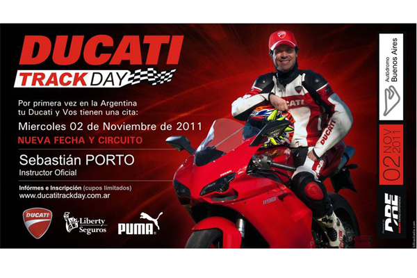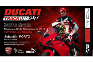 Ducati Track Day 27/10/2011 by Staff Leave a comment Por primera vez en la Argentina!! El miércoles 02 de Noviembre, arranca con un nuevo circuito a cargo de Sebástian Porto como Instructor Oficial. Inscribite en www.ducatitrackday.com.ar. Tu Ducati y Vos tienen una cita!!!