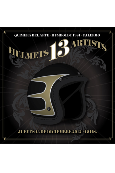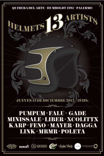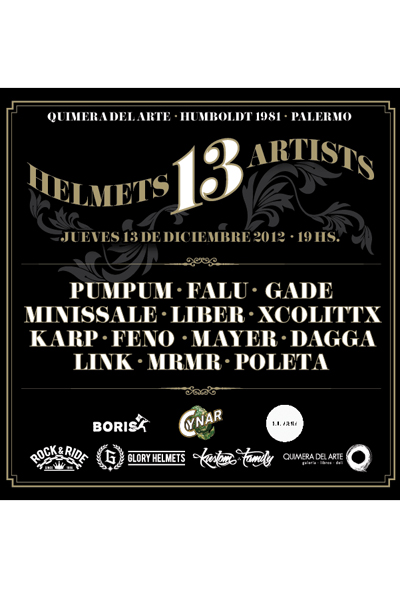 El 13 los 13 de Glory Helmets 12/12/2012 by Staff Leave a comment De la mano de Glory Helmets y con el apoyo de Rock & Ride y Kustom Family este jueves 13 de diciembre todos presentes en la muestra de los 13 cascos intervenidos por 13 artistas de lujo!