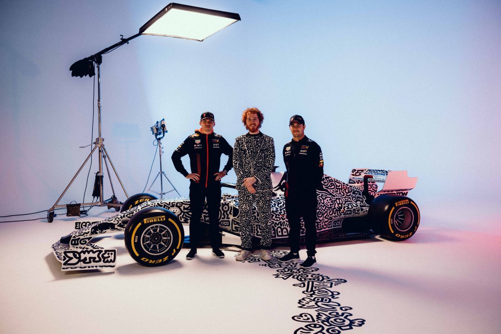 Mr. Doodle, Max Verstappen and Sergio Perez seen during a photo shoot of the collaboration of Red Bull Racing and Mr. Doodle with the RB14 in London, United Kingdom in 2023. // Red Bull Racing / Red Bull Content Pool // SI202301310364 // Usage for editorial use only //