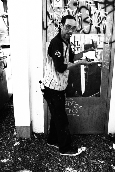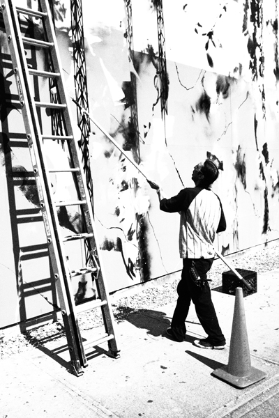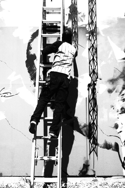 El objetivo de Goldman fue convertir esta pared en un lienzo para los artistas callejeros contemporáneos más reconocidos alrededor del mundo. Futura 2000 es el nombre artístico de Lenny Mc Gurr un genial pintor y diseñador nacido y criado en Nueva York. Aunque sus comienzos fueron con el graffiti, su estilo abstracto de inspiración espacial lo convirtieron en un favorito de las galerías del street art mundial. Su temprana fama comenzó gracias al seminal libro “Spaycan Art” y muy buenos documentales como Style wars. Cuando tenía 24 años este joven neoyorquino se fue de gira con el grupo británico The Clash y realizaba en vivo las escenografías de sus shows en NYC, Londres y Paris. Y hasta diseñó el arte de su single Radio Clash pintando el famoso Boombox, participó del video junto al rapper Fab Five Freddie y realizó toda la tipografía y diseño del genial disco de post punk Combat Rock que incluía los singles Rock the Cashbah y Should I stay or Should I go. Inicialmente a fines de los 80 la diseñadora francesa Agnes B lo sacó del ostracismo y le permitió ponerse de nuevo de pie. Años después se consagró cuando realizó el arte de tapa del proyecto musical del Dj inglés James Lavelle, UNKLE, para el sello Mo Wax. Ahí sus famosos diseños humanoides de largos brazos puntiagudos llamados Pointman y sus esferas de trazos rápidos lograron reconocimiento en todo el planeta. La obra del mural se llama “Concrete Jungle” y como dijo la mítica fotógrafa Martha Cooper, (busquen su blog Kodakgirl.com) tiene un estilo que recuerda a su pieza “Break” de 1980. Muchos amigos, familia y curiosos como nosotros miraban extasiados ante el talento y destreza de Futura no solo con los pinceles y rodillos, sino también con su sprays de pintura Montana.