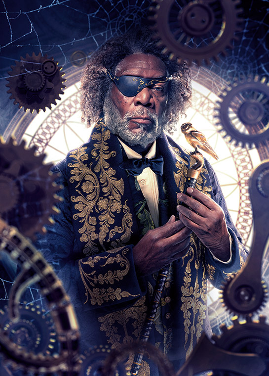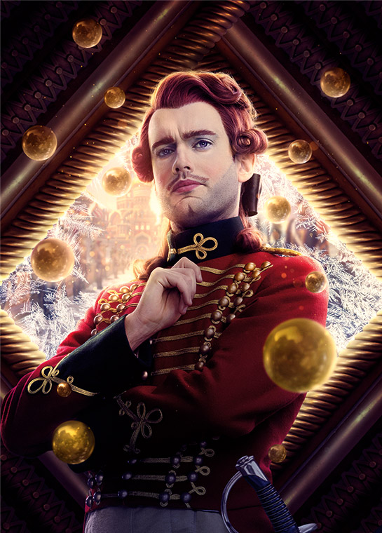 DROSSELMEYER (Morgan Freeman) es el padrino sabio y misterioso de Clara. Es un adinerado trotamundos, coleccionista de curiosidades y un hombre de ciencia. Posee un corazón generoso: en su baile anual de Navidad organiza elaboradas búsquedas de obsequios para los niños. Drosselmeyer siente una debilidad por Clara ya que es la más se parece a su madre, Marie, a quien él crió cuando quedó huérfana de niña. Marie confió en Drosselmeyer para que ayudara a facilitar el viaje de Clara por los Cuatro Reinos, un papel que él se toma muy en serio.