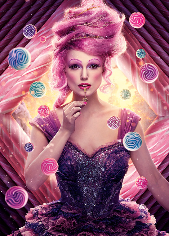 El hada SUGAR PLUM (Keira Knightley) es la adorada reina de la Tierra de los Dulces: el reino más delicioso, con una arquitectura de galletas de jengibre y decoración de gomitas azucaradas. Sugar Plum es elegante, etérea y naturalmente dulce, y usa un vestido que brilla como azúcar cristalizada. Recibe a Clara en los Cuatro Reinos con los brazos abiertos y la declara invitada de honor en una extravagante interpretación. La madre de Clara, Marie, solía ser la mejor amiga de Sugar Plum, así que Clara es parte de la familia.