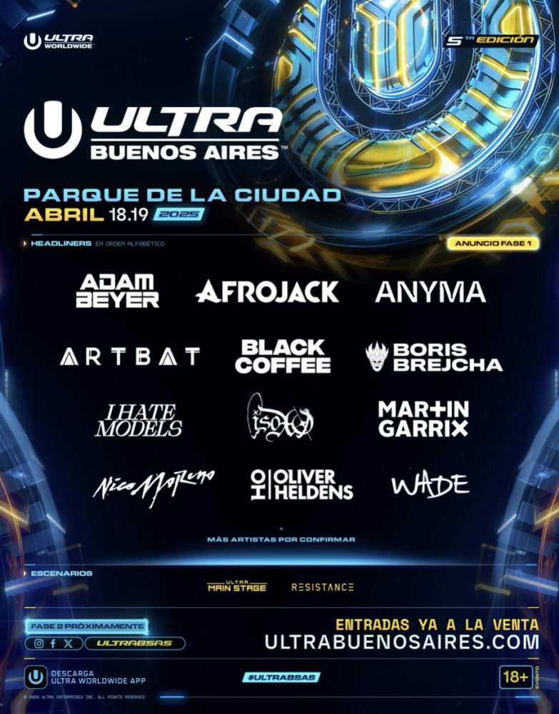 ULTRA Buenos Aires acaba de anunciar su impresionante lineup de Fase 1, que cuenta con una selección de influyentes artistas globales para el esperado regreso del festival a Argentina el próximo año, que se llevará a cabo desde el viernes 18 de abril hasta el sábado 19 de abril de 2025, en su hogar anterior, el Parque de la Ciudad.