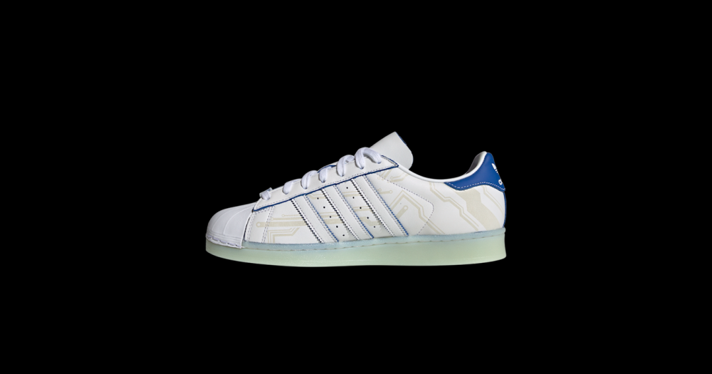 La zapatilla Ninja Superstar 50 presenta una serie de detalles divertidos, estan confeccionadas en una parte superior de cuero completamente blanco con una puntera también de cuero. El estilo característico de Ninja cobra vida a través de acentos azules contrastantes. Insistiendo en la idea de que el modo de juego de Ninja es tan bueno que debe estar alimentado por microchips internos, el lado medio de la zapatilla presenta un gráfico de chip de computadora en relieve.