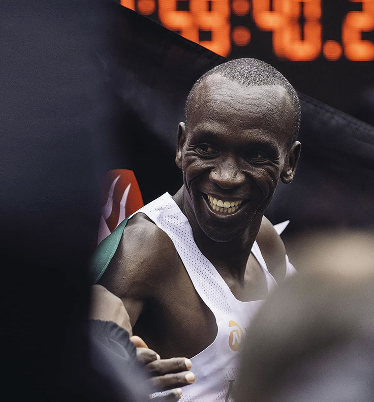 El corredor africano logró finalmente bajar el tiempo de dos horas en correr la Maratón. Histórico #Breaking2. El 6 de mayo de 2017 en Monza, Italia, Eliud Kipchoge participó en #Breaking2, la búsqueda de Nike para romper la barrera del maratón de dos horas. Su tiempo final, 2:00:25, son los 42k más rápidos de la humanidad. Este proyecto fue comandado por nuestro héroe Sandy Bodecker junto al maratonista keniano.