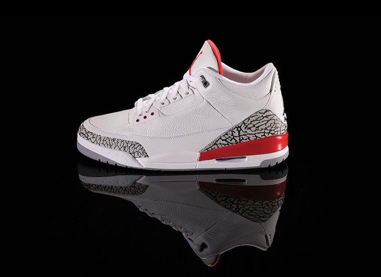 Air Jordan III. La zapatilla Air Jordan III incorporó la primera unidad visible de suela Air, junto con la introducción del afamado print de elefante y la primera aparición del logo de Jumpman.  Diseñadas por Tinker Hatfield.