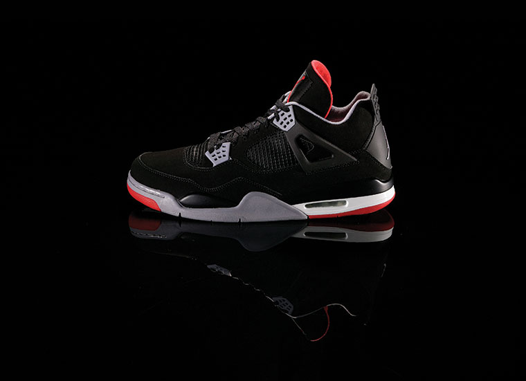 Air Jordan IV. . En las zapatillas Air Jodan IV las Alas de poliuretano termoplástico e inserciones de mesh aireado hicieron más liviano al calzado, con mayor soporte del tobillo y también la introducción del icónico color cemento y la palabra “Flight” debajo del Jumpman. Diseñadas por Tinker Hatfield.