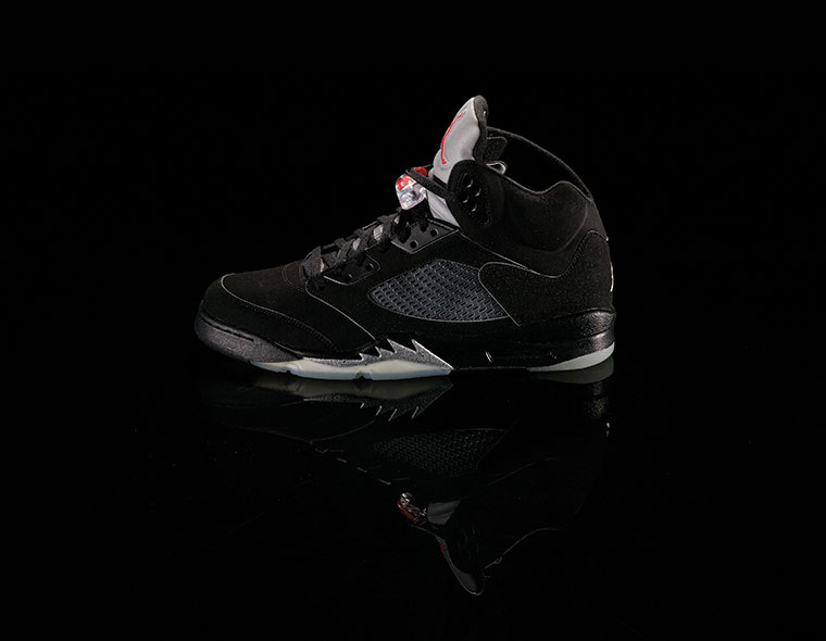 Air Jordan V. La zapatilla Air Jordan V contiene formas de diente de tiburón en la suela media, cierres “lace-lock” de los cordones, una lengua refractaria y una moldura comprimida dieron forma a un look feroz con tracción agresiva. Diseñadas por Tinker Hatfield.