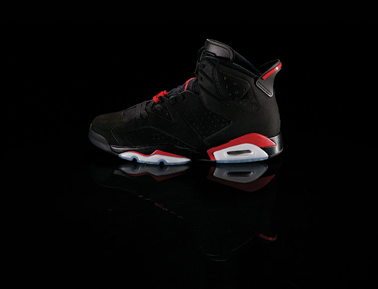 Air Jordan VI. En la zapatilla Air Jordan VI una manga de neoprene, “pul-tab” trasero y una tracción circular realzaban la durabilidad. Una lengueta de goma, sujetadores de cordones y una clara suela exterior de goma lograban ajustar al calzado. Diseñadas por Tinker Hatfield.