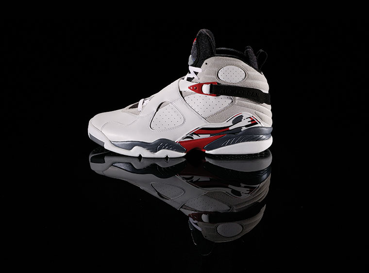 Air Jordan VIII. La zapatilla Air Jordan VIII contiene un soporte TPU externo y una placa de policarburetano, junto a franjas anti-inversión que la atravesaban y acorchado extra envolvían al pie para protegerlo.