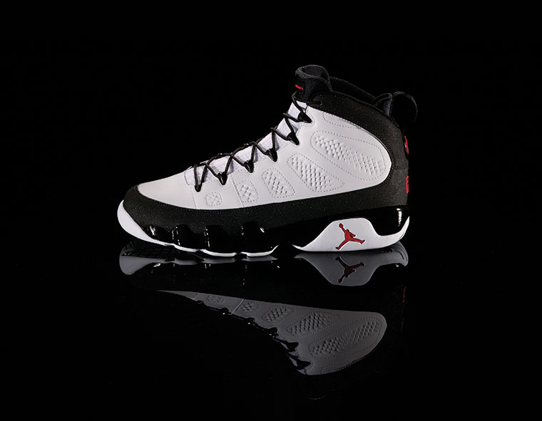 Air Jordan IX. La zapatilla Air Jordan IX contiene cordones de velocidad y una manga interna para confort. Este modelo incluía la novedad estética de palabra en las suelas.