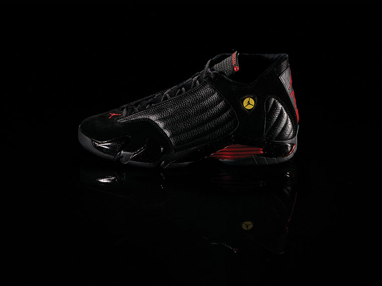 Air Jordan XIV. Las zapatillas Air Jordan XIV contienen una ventilación mesh en la suela externa, sumada a una doble unidad Zoom Air, un corte asimético del tobillo y 14 logos de Jumpman contribuyeron a este modelo ideal de performance. Diseñadas por Tinker Hatfield y Marc Smith.