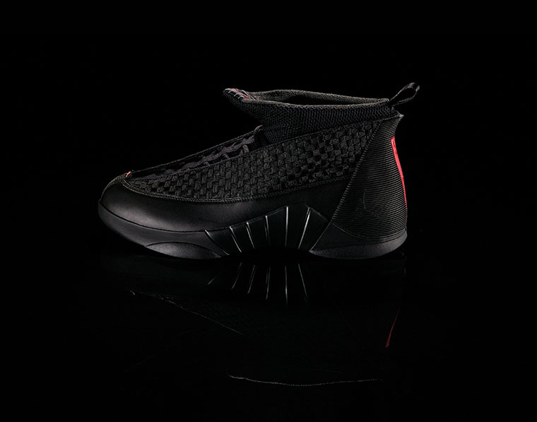 Air Jordan XV. La zapatilla Air Jordan XV tiene una duradera fibra aramid de Kevlar sobre una unidad Zoom Air y una placa Pebax para estabilidad, este modelo estableció algo duro y liviano a la vez. Los números 23.6.15 del talón hacen referencia, 23 al número de camiseta que usaba Jordan, 6 a los campeonatos de NBA ganados, y 15 al número de Air Jordan.