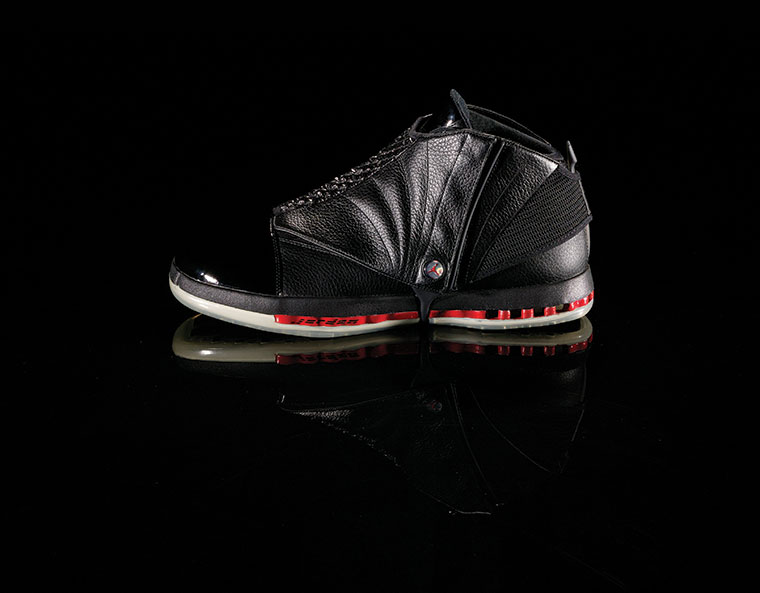 Air Jordan XVI. La zapatilla Air Jordan XVI marcó el regreso de suelas de goma claras, cuero patentadoe inserts de mesh, además de un corte de altura media. Una capa removible de cuero cubría al calzado y tenía funcionalidad térmica. Diseñadas por Wilson Smith.