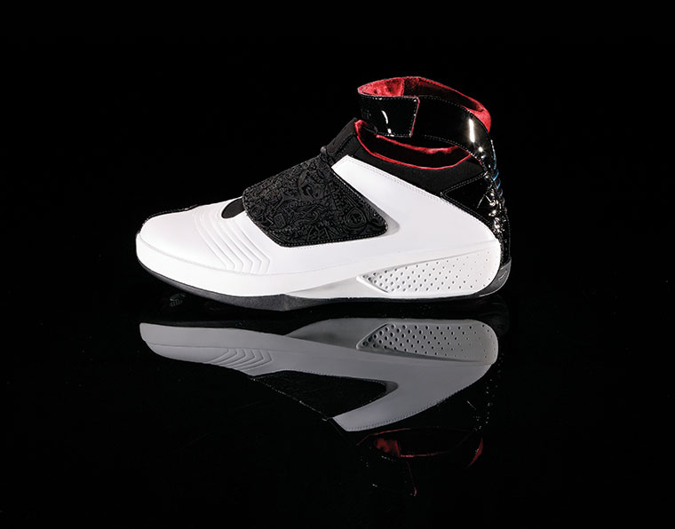 Air Jordan XX. La edición del vigésimo aniversario Air Jordan XX incluyó un revestimiento esférico con un sistema de suspensión podular IPS, sujetador de la parte media del pie y una correa multi-posición del tobillo inspirada en el calzado de ciclismo.