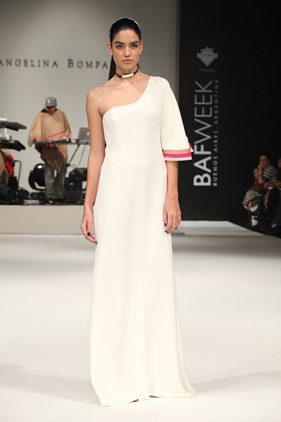El blanco dijo presente en la pasarela de la mano de un vestido largo con hombro al descubierto y detalles en fuccia.