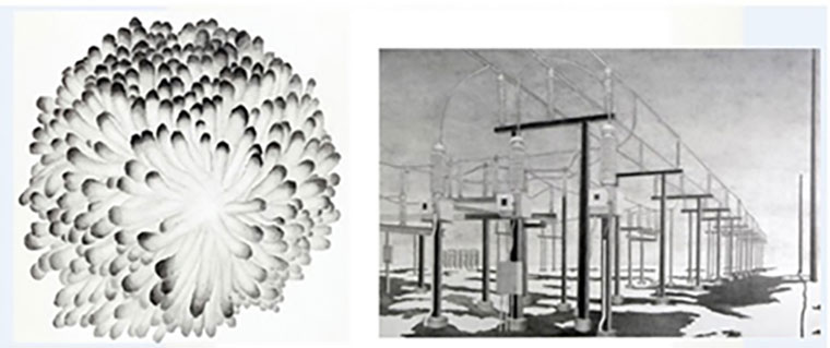 Flora. (Políptico) Grafito sobre papel. 43cm x 36cm. Central eléctrica. Grafito sobre papel. 69cm x 45cm.
