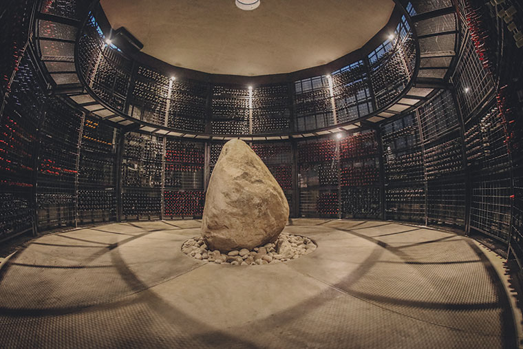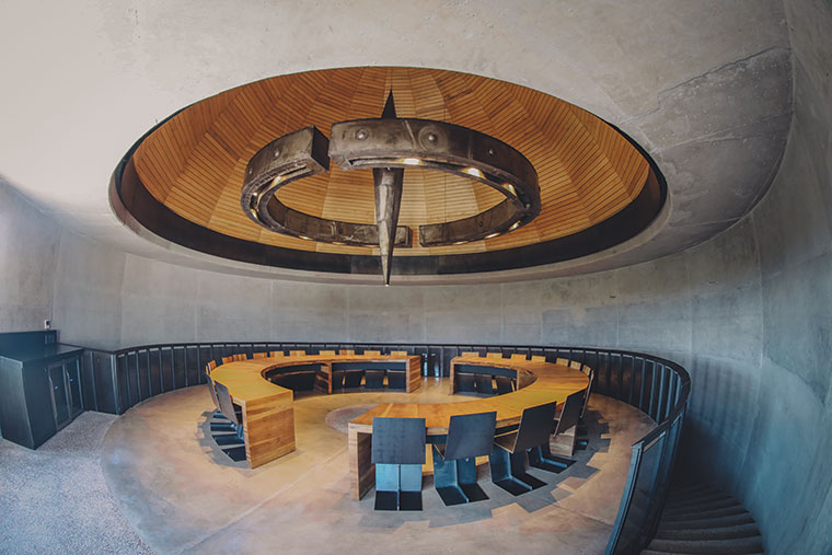 La sala de cata ofrece una lámpara gigante, construida en acero soldado por el artista mendocino Guillermo Rigattieri, que recuerda a una estructura estelar.