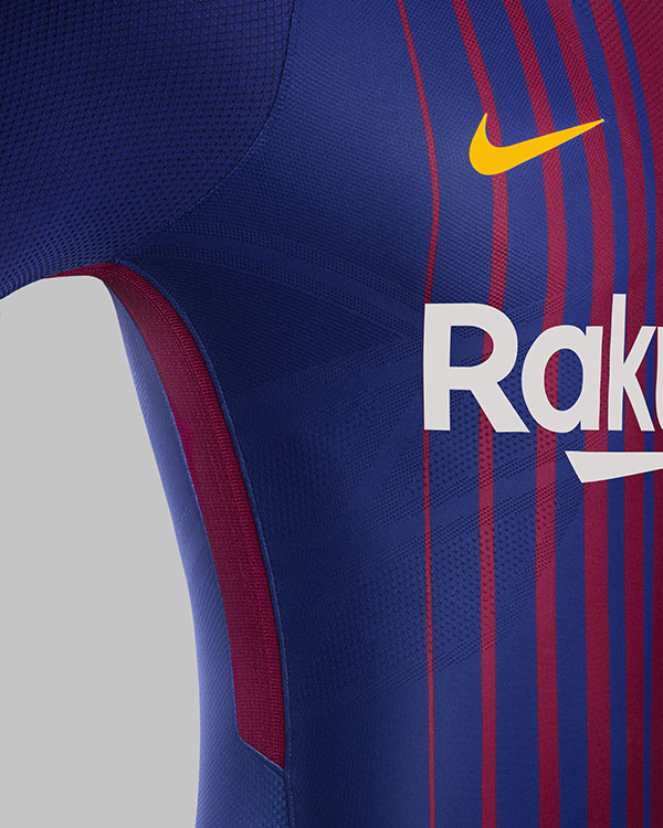 Los lados del kit cuentan con una franja de color rojo oscuro que recorre la longitud de la camisa blaugrana y pantalones cortos azules. Al expandirse cuando el jugador está en movimiento, la franja maximiza la ventilación.