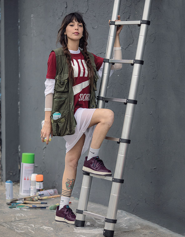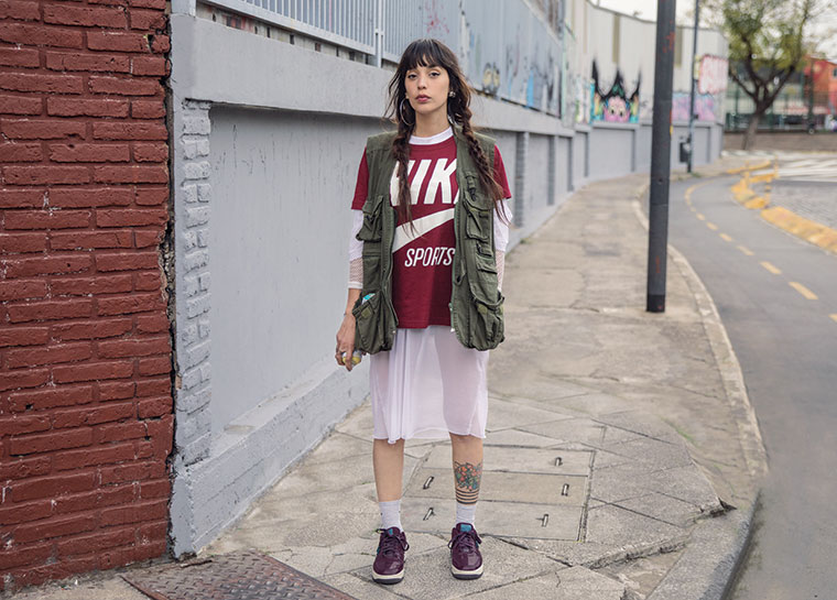 chaleco militar FIO SILVA, t-shirt bordo Nike Sportswear, remera calada+falda de tul THIS IS, medias NIKE, zapatillas Nike Air Force 1 port wine, pinceles+aerosoles MONTANA