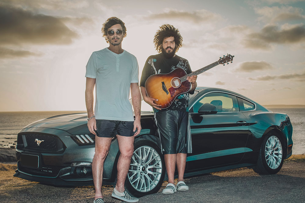 Emmanuel Horvilleur y Matias Rada junto al Mustang en el atardecer de Punta Del Este.