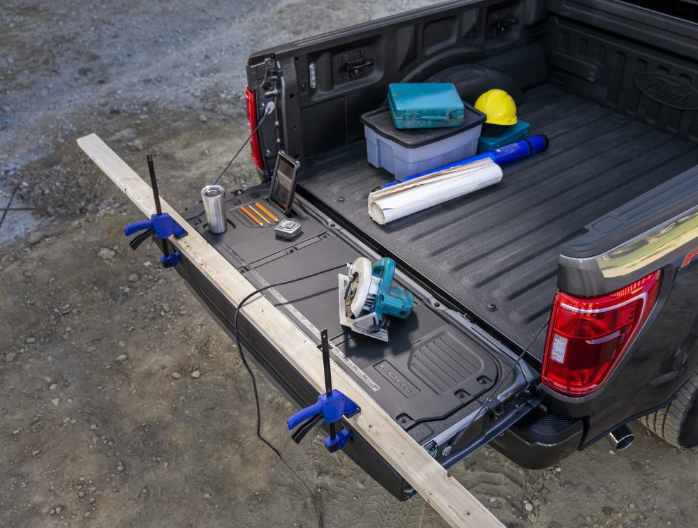 • Espacio de trabajo en portón de caja de carga con diseño integrado y soporte para dispositivo móvil, portavasos y portalápices.