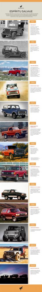 La experiencia de esta SUV off-road de Ford se remonta a la Segunda Guerra Mundial, cuando la automotriz fue parte de la competencia gubernamental para crear utilitarios de carga para el ejército en el campo de batalla. La entrada de Ford se llamó GP por General Purpose (“Propósito General”). Más de 270 mil GPs de Ford fueron construidos para las fuerzas “Aliadas”. Los ejércitos que volvieron compraron unidades para trabajar y jugar, pero eran muy pequeñas e incómodas para la vida civil, de acuerdo con la investigación realizada por Ford en los comienzos de 1960, así que Ford desarrolló un vehículo off-road más refinado, espacioso y durable para satisfacer esta necesidad: la Bronco.