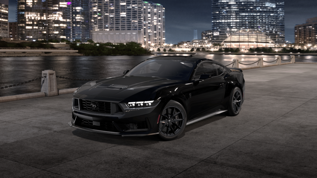 El aspecto agresivo de la carrocería indica que el Mustang Dark Horse es un ejemplardiferenciado, de presencia imponente. A las líneas rectas que caracterizan a esta séptima generación de Mustang, se incorpora una estética totalmente oscura y agresiva, tal como su nombre lo indica. La séptima generación de Mustang propone una reinterpretación actual de los elementos de diseño originales y atemporales del ícono, manteniendo el clásico ADN Mustang. Su silueta conserva las proporciones clásicas de capot largo, parte trasera corta y techo bajo, pero con una nueva interpretación estilística. Las líneas de la carrocería muestran pliegues más definidos y radios más cortos, con transiciones rápidas que destacan su aerodinámica mejorada en túnel de viento.