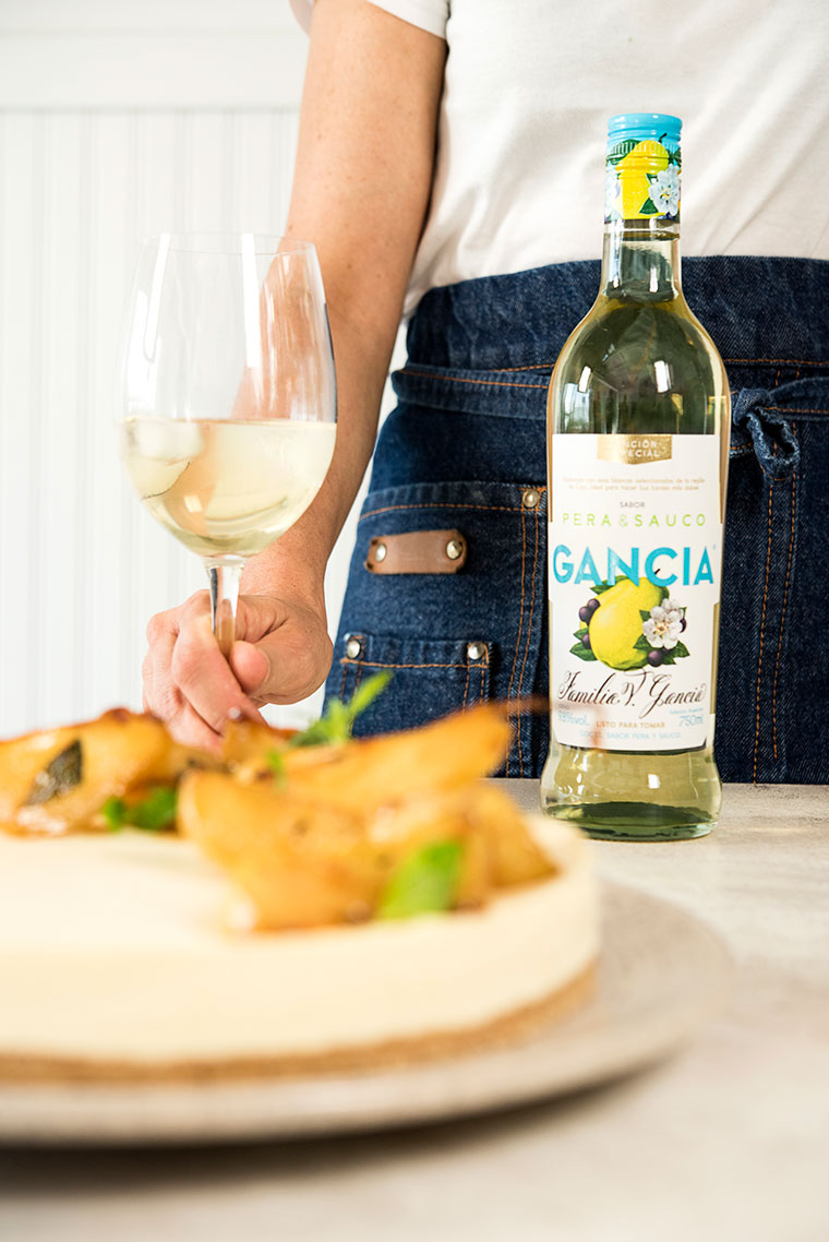 Brunch dulce: Cheesecake cocido con peras doradas con azúcar y menta.