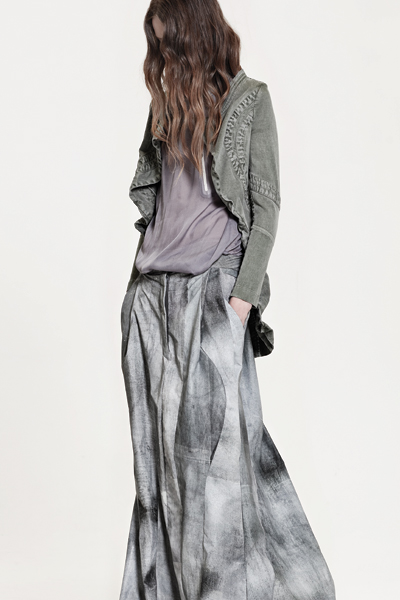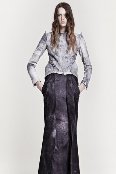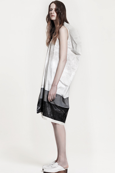 La colección se inspiró en un sofisticado vagabundo, famoso por recorrer las calles de Buenos Aires cubierto con bolsas de basura que forman fantásticas figuras alrededor de su cuerpo. Él es la personificación, y en cierto modo la versión más extrema, de la estética y filosofía “Do it your Self” que ha caracterizado los esfuerzos de Trosman desde sus inicios. Jessica se casó con la libertad de este artista sin hogar y con la imaginería Sci Fiction de una fábrica de helados. Pantalones de cuero y largas faldas se ondulan como las hojas del frío acero mientras que las chaquetas cuelgan sin esfuerzo de los hombros y espalda como si hubieran aterrizado en los modelos después de una tormenta cremosa.