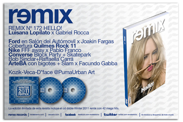 Qué esperas para tener tu Revista Remix con todo lo que es tendencia. En tapa, nuestra «diosa made in» Luisana Lopilato con bigotes fotografiada por el genial Gaby Rocca y toda una colección de instántaneas con bigotes de las celebrities más cancheras (Hasta los artistas de arteBA) Y la cobertura de todos los eventos que rockearon: Converse BlocParty+SkatePark. También Puma Urban Art+Salón del Automóvil. Y Winter 11 con todos los megahits!
