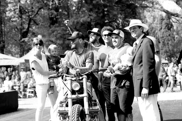 Vicky Phelan con Aitor Lozada, Fede Lozada, Kircho, Lucas Aragona, German Karp con Dieter Karp, recibiendo premio a Mejor moto Customizada por Herencia Custom Garage