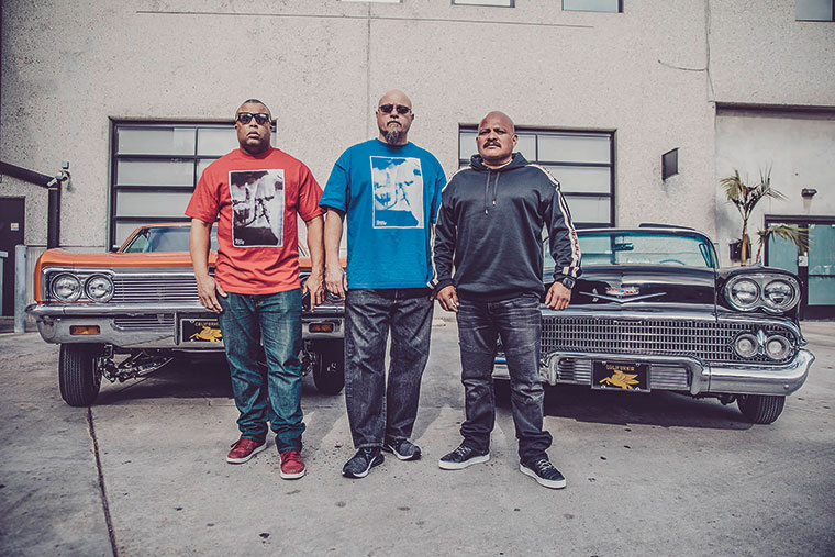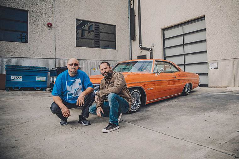 Los fotógrafos Estevan Oriol y Pablo Franco posan junto a unos Low Riders en el estudio de Oriol y el tatuador Mr Cartoon en la calle 6th en East LA