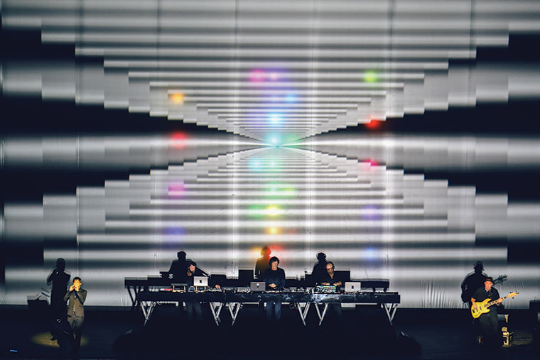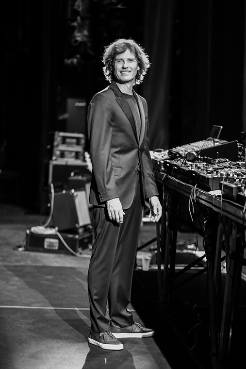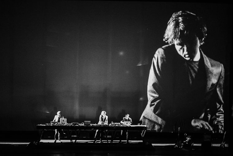 Porque tenés que bailar, y para que la música te sacuda. Acá no tiene que sacudir. Acá tiene que entrar por la cabeza. Es mental. Diseñamos la parte de sonido de este show con el sonidista y con los chicos, de forma que la mayor parte de los decibeles que teníamos para usar lo utilizamos en la parte melódica, que no tiene tanto peso. Y no es que bajamos el kick, sino que le sacamos sonoridad. Yo soy el DJ. Estoy en el medio con el control de DJ y los músicos electrónicos a los dos costados: Oliverio y Baunder. Tengo sonidos, efectos, a cappellas y texturas en mi consola. Todo lo que hacen los músicos entra a mi mixer, y yo controlo a los tres desde acá.