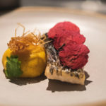 -Langostinos curados, pure de nuez de marañón, piña parrillada, hojas de ostra y vinagreta de vinagre de plátano y panela (Vino: DV Catena chardonnay 2015).