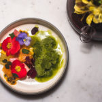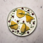 -Vieiras con salsa fría de leche de coco, limón mandarino lacto fermentado, mango biche fermentado, salicornias, flor bastón del emperador y aceite de cilantro. (Vino: Las Perdices Albariño)