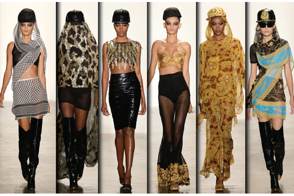 Vinilos estampados y poderosas lentejuelas, los motivos arábigos capturaron todos los flashes! En pasarela, despampanantes modelos de piel caramelo lucieron ajustadísimas faldas tubo con tops y corpiños al mejor estilo Versace vintage; transparencias acompañadas con altísimas botas charoladas e interminables pañuelos y túnicas. Pero sin duda,