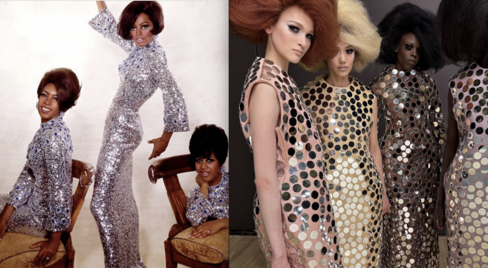 Esta vez Marc se inspiró en los figurines de las muñecas de papel con siluetas fantásticas que marcan las curvas de las mujeres. El mood board no faltaron referencias a los grupos de mujeres de los Sesenta como Las Supreme y sus vestidos con espejos redondos y las Ronette y sus trajecitos con botones gigantes. Las pelucas del hair designer irlandés @Duffy_duffy contrastaron con el make up de grandes pestañas de Kendal y el perfecto estilismo del inglés alastairmckimm.