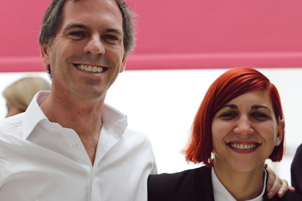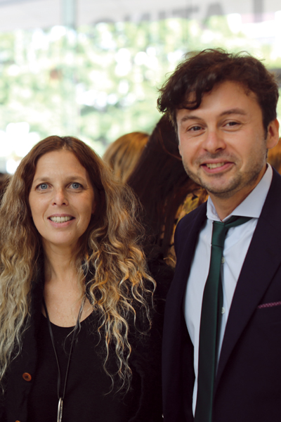 El arquitecto y ambientador Javier Iturrioz sonríe junto a la artista chilena Catalina Swinburn.