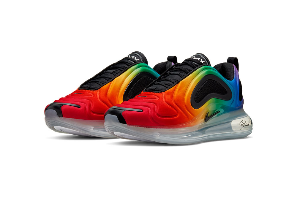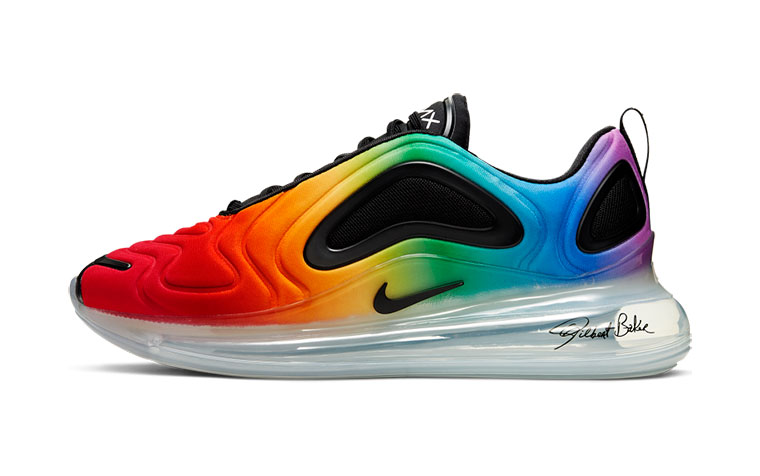 Esta edición especial del Air Max 720 viene en un esquema de color nunca antes visto, con un espectro de ocho colores en la parte superior y la unidad de Air transparente tiene la firma de Baker. El gráfico de la plantilla representa los ocho colores y significados de la bandera original en 1978.