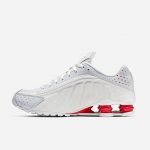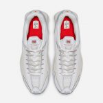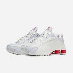 Una segunda versión en blanco y rojo con logotipos de varios tamaños se replican desde la punta hasta el talón. Este pack de calzado también lleva el nombre de la estrella de fútbol en la lengüeta, con el logo de Shox en su lado.