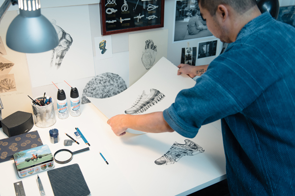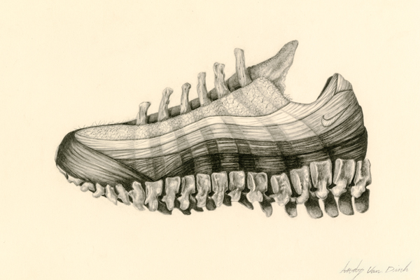 Para celebrar el vigésimo aniversario de las Air Max 95, dos artistas conocidos por sus trabajos basados en la anatomía tuvieron la tarea de ilustrar la icónica silueta [enlace a la historia de herencia] y sus versiones actualizadas que se presentaron recientemente [enlace a historia de innovación] como si estuvieran hechas de carne y hueso. Las imágenes representan visualmente la historia de inspiración del calzado.