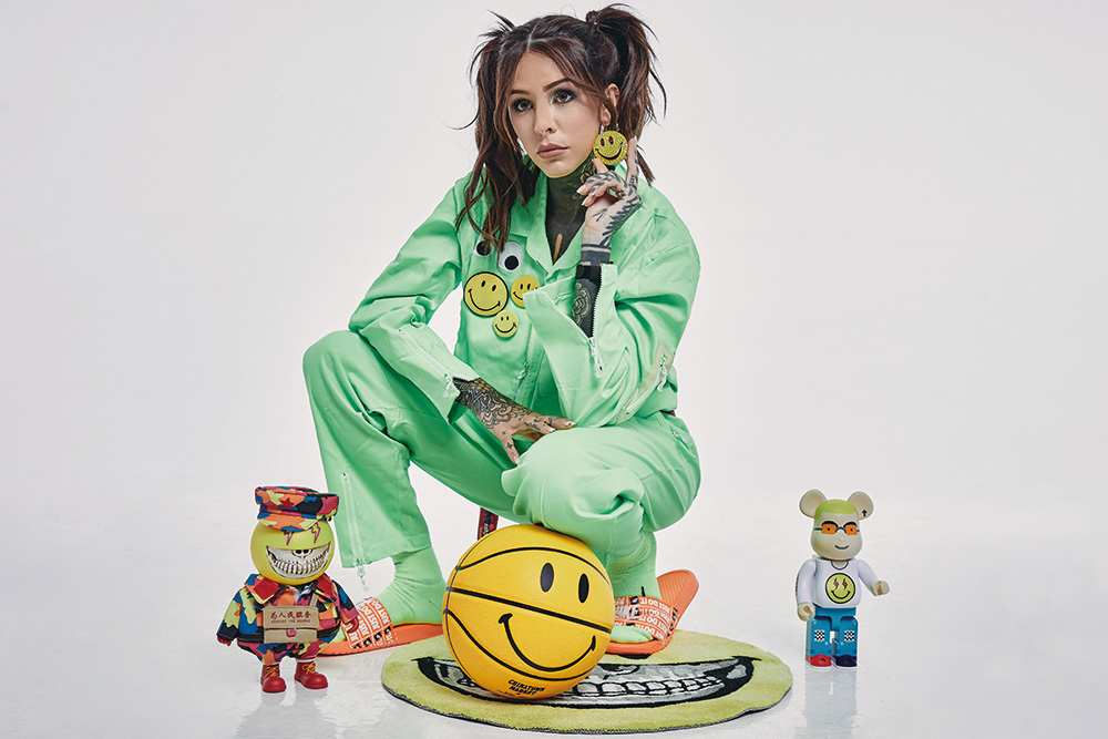 mameluco verde fluo con cinto bordó de Kid Super x J Balvin, aro Smile strass remix, mameluco verde fluo con cinto bordó de Kid Super x J Balvin, pin Smile “This is not a toy” x Jean-Charles de Castelbajac, pin Smile x Og Slick, pin Smile x Ron Herman, medias volt x Nike Running, ojotas Nike Benassi Just Do it naranja, alfombra circular Smile Grin x Ron English, J Balvin Familia Mao x Ron English, Bearbrick J Balvin Energia x Medicom Jp, pelota de basquet Smile x Chinatown Market