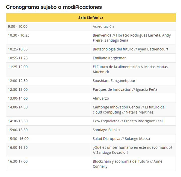 Santiago Bilinkis, emprendedor y tecnólogo; Gustavo Aguirre, ingeniero y fundador de BeLiquid; Anne Conelly, consultora en Blockchain; y Solange Massa, creadora del “hígado en un chip” y ganadora de Innovadores menores de 35 del MIT Technology Review, serán algunos de los oradores que disertarán en la Sala Sinfónica, espacio conducido por Joan Cwaik.