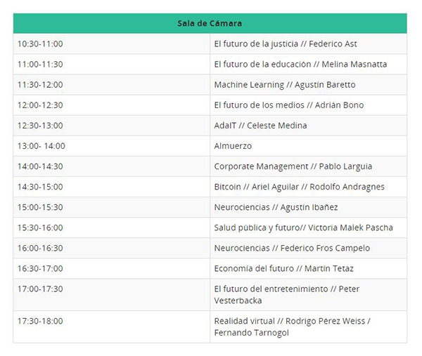 Por otro lado, las charlas de la Sala de Cámara serán moderadas por Diego Pasjalidis. El fundador de Angry Birds, Peter Vesterbacka; el economista Marín Tetaz; María Celeste Medina, directora de AdaIT; Melina Masnatta, cofundadora de Chicas en Tecnología; y Federico Fros Campelo, ingeniero industrial especialista en neurociencias, son algunos de los que conforman la lista de esta sala.