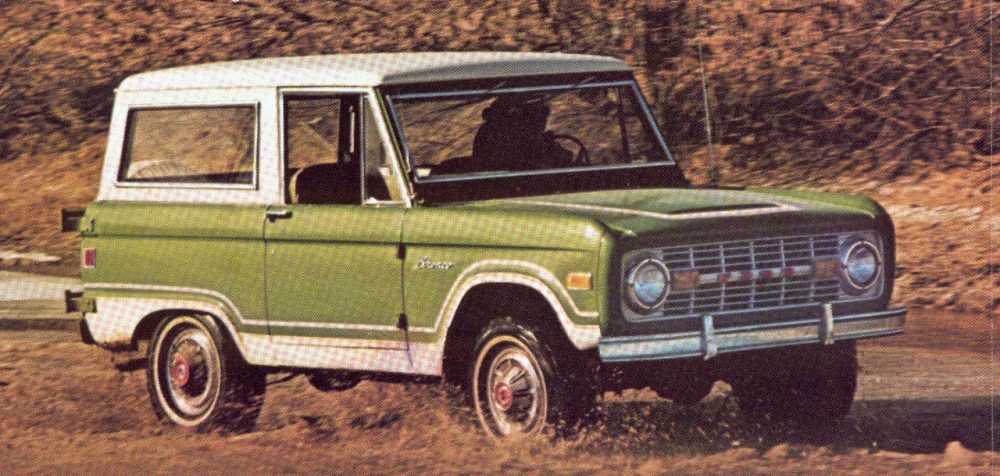 - Los primeros borradores de Bronco datan del 24 de julio de 1963 y fueron realizados por McKinley Thompson, el primer diseñador afroamericano de la compañía. Mostraban la forma cuadrada clásica del vehículo en una versión de dos puertas. La idea pasó por múltiples revisiones y transformaciones hasta que en 1965 se presentaron oficialmente los primeros tres modelos: Roadster (sin techo), Sports Utility (Utilitario deportivo) con caja y Wagon (dos puertas, cola larga y techo completo); este último fue el modelo más popular.