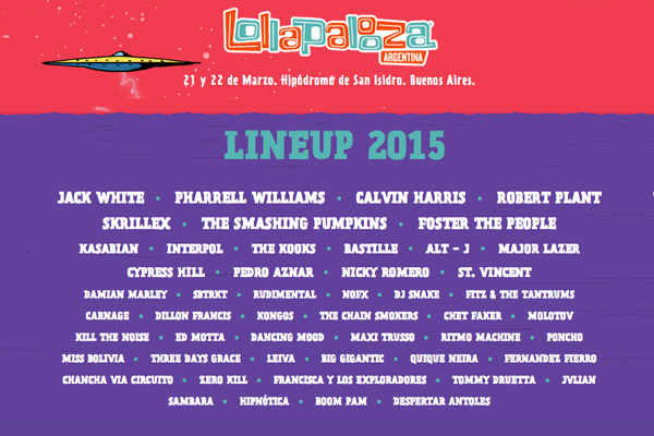 Jack White, Pharrell Williams, Calvin Harris, Robert Plant, Skrillex, The Smashing Pumpkins, Foster the People, Kasabian, Interpol, The Kooks, Bastille, Alt J, Major Lazer, Cypress Hill, Pedro Aznar, Nicky Romero y St Vincente, son algunos de los artistas que vendrán el año entrante.