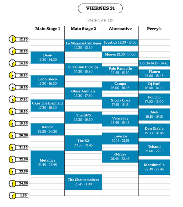 Este fin de semana se llevará a cabo una nueva edición del Lollapalooza Argentina: dos fechas donde más de 50 bandas pisarán los cinco escenarios dispuestos en el hipódromo de San Isidro; más de 13 horas de música tanto el viernes 31 como el sábado 1 de abril. Este año se presentarán Metallica, The Strokes, The Weeknd, The XX, The Chainsmokers, Martin Garrix, Flume, Cage The Elephant, Duran Duran, Rancid, The 1975, Usted Señalemelo y muchas bandas más, de la cuales 19 tendrán su debut en suelo Argentino el próximo fin de semana.