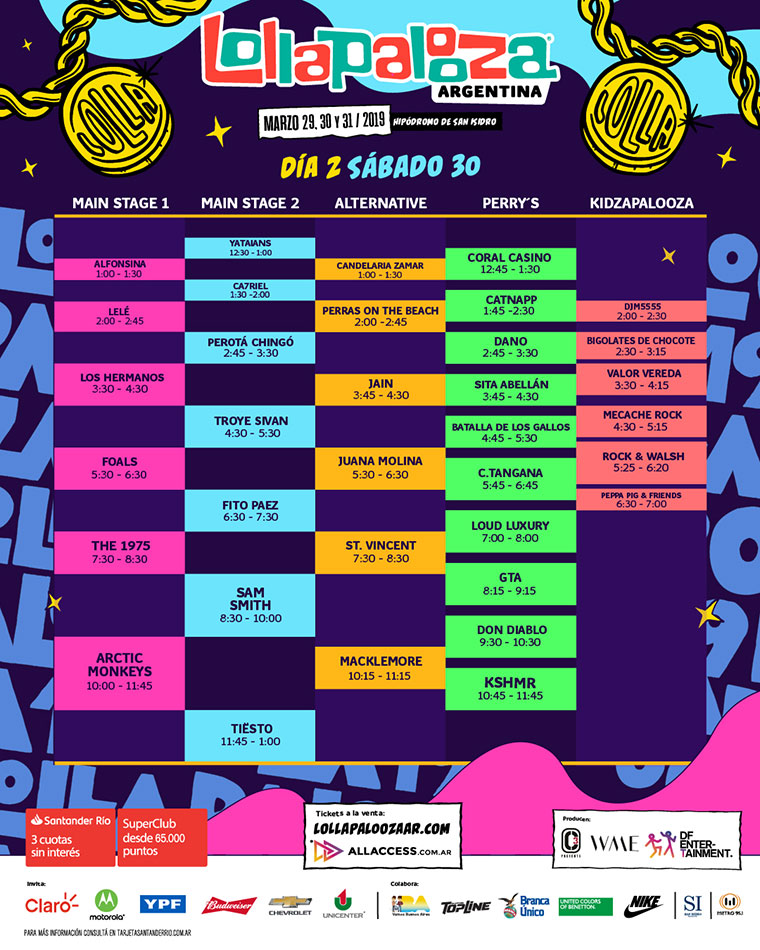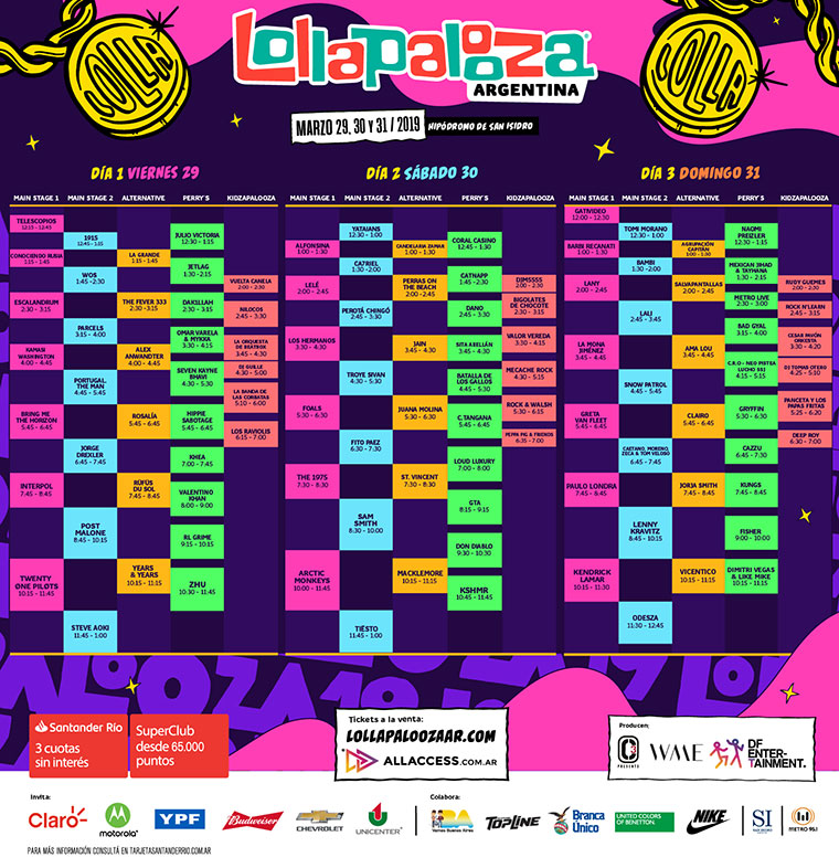 Lollapalooza Argentina se llevará a cabo el viernes 29, sábado 30 y domingo 31 de marzo en el Hipódromo de San Isidro. Los tickets se pueden conseguir desde $2500 + Service Charge a través de www.AllAccess.com.ar y sus puntos de venta habilitados.