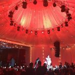 A las 22 pm los afortunados subieron al primer piso del Faena Forum donde 33 mesas distribuían a los famosos, top models y los benefactores se sentaron a lo largo del salón decorado con telas blancas y luces de colores simulando una carpa de circo.